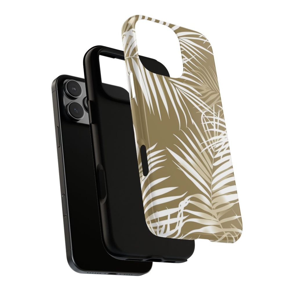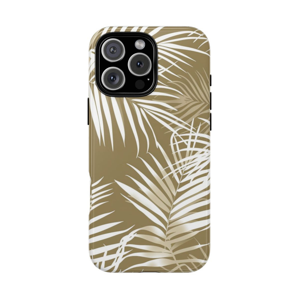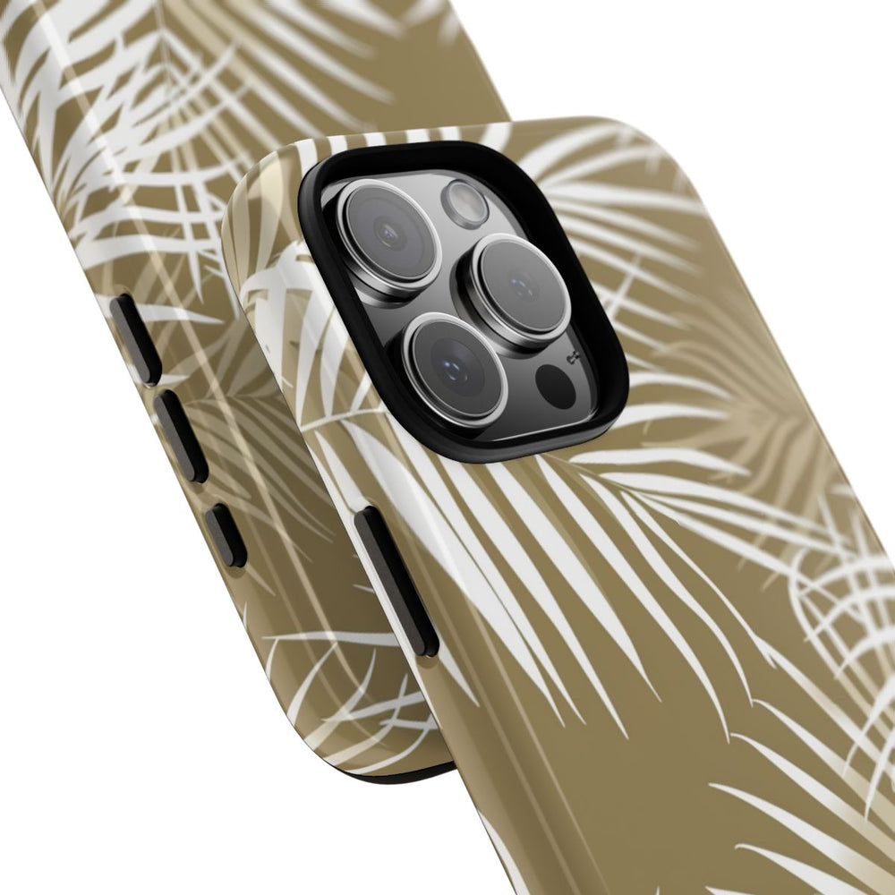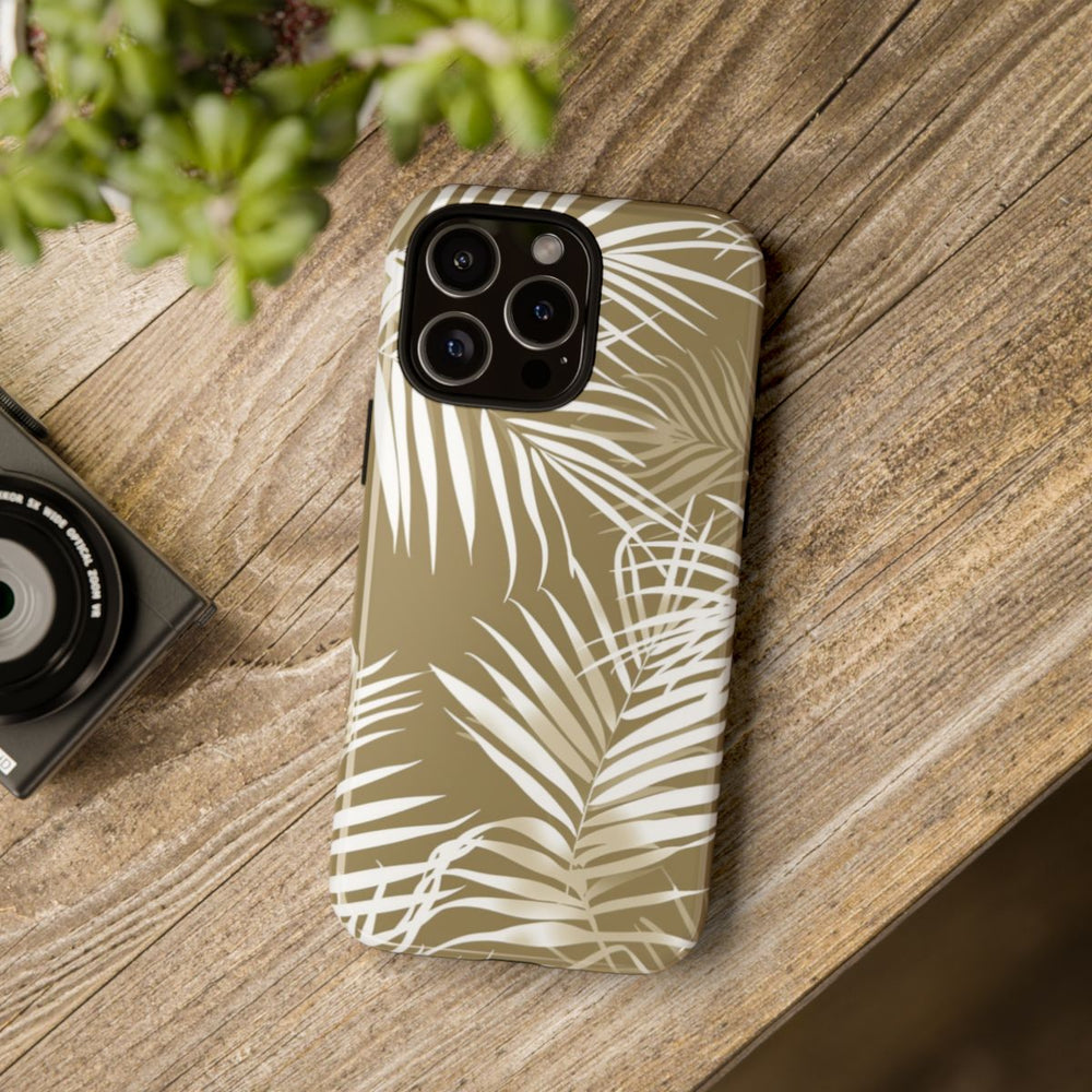 Dit telefoonhoesje heeft een naadloos patroon van witte palmbladeren op een khaki achtergrond. De palmbladeren verschillen in grootte en richting, wat zorgt voor een natuurlijke en tropische uitstraling. Het patroon loopt vloeiend door, waardoor het hoesje rondom mooi bedekt is. Het glanzende, stevige hoesje bestaat uit een dubbele laag met een polycarbonaat buitenkant en een TPU binnenzijde voor extra stevigheid en bescherming. Geschikt voor draadloos opladen en bestand tegen weersinvloeden.