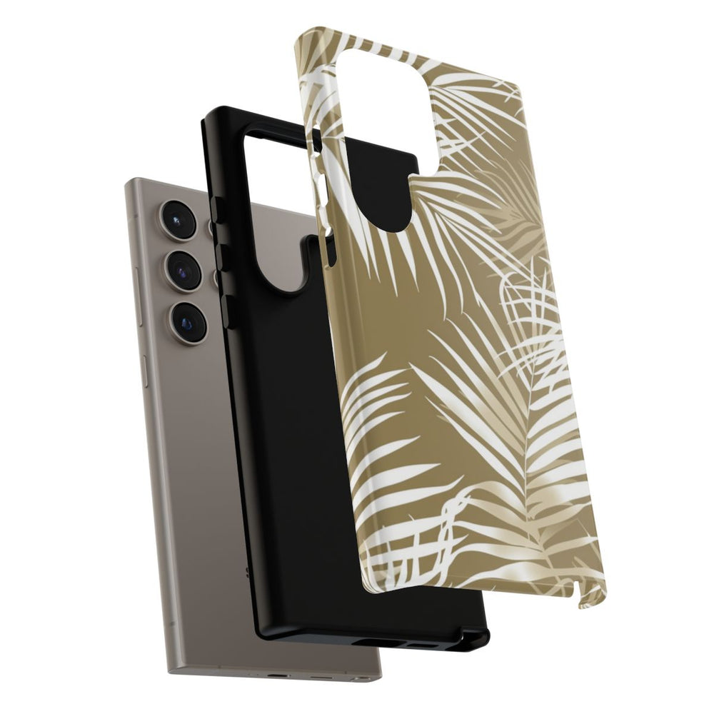 Dit telefoonhoesje heeft een naadloos patroon van witte palmbladeren op een khaki achtergrond. De palmbladeren verschillen in grootte en richting, wat zorgt voor een natuurlijke en tropische uitstraling. Het patroon loopt vloeiend door, waardoor het hoesje rondom mooi bedekt is. Het glanzende, stevige hoesje bestaat uit een dubbele laag met een polycarbonaat buitenkant en een TPU binnenzijde voor extra stevigheid en bescherming. Geschikt voor draadloos opladen en bestand tegen weersinvloeden.