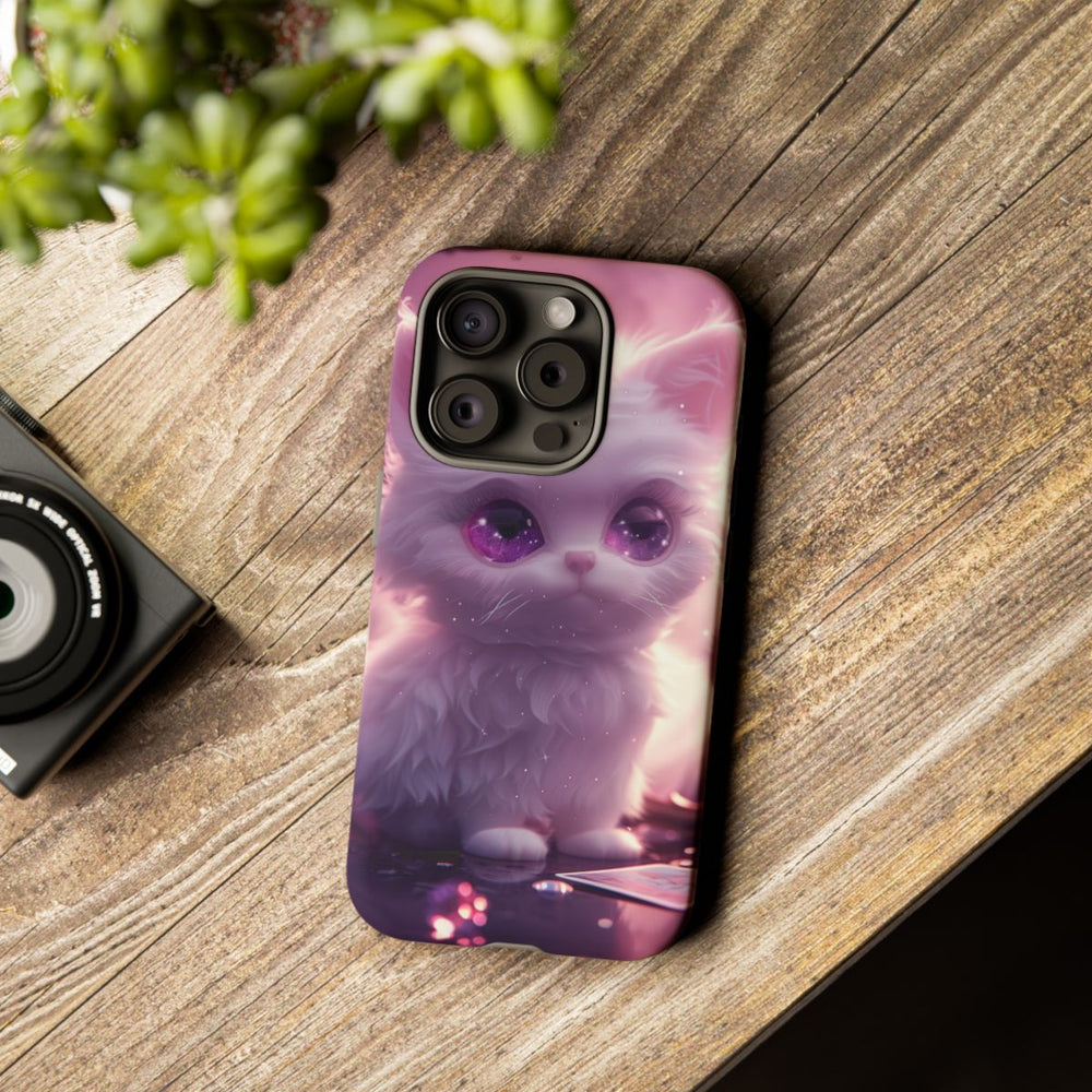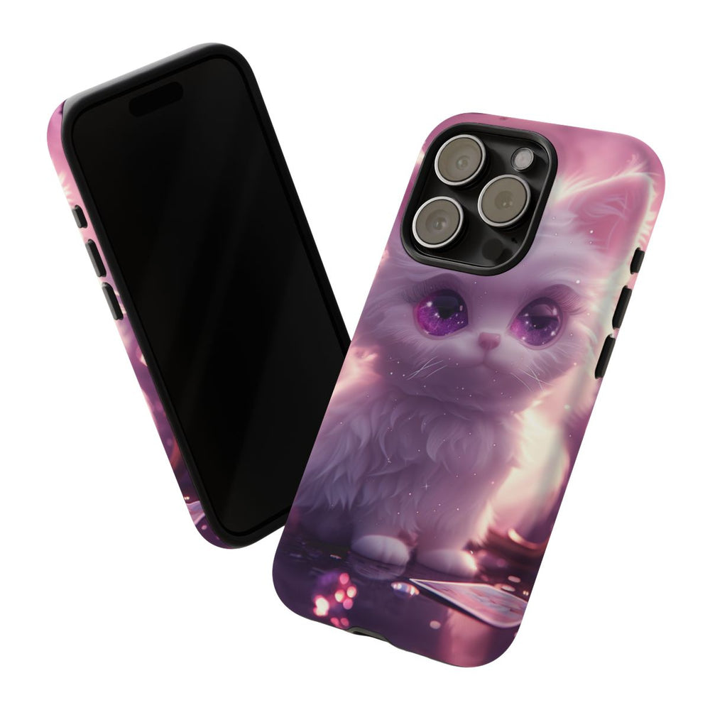 Dit telefoonhoesje toont een witte, pluizige kat met grote, sprankelende paarse ogen die voor een sierlijke spiegel zit. De scène is gehuld in zacht roze en paars licht, wat zorgt voor een dromerige en magische sfeer. Kleine glinsteringen en lichtgevende bolletjes omringen de kat en versterken het sprookjesachtige gevoel. Het hoesje bestaat uit twee lagen van polycarbonaat en TPU voor extra stevigheid en is geschikt voor draadloos opladen.