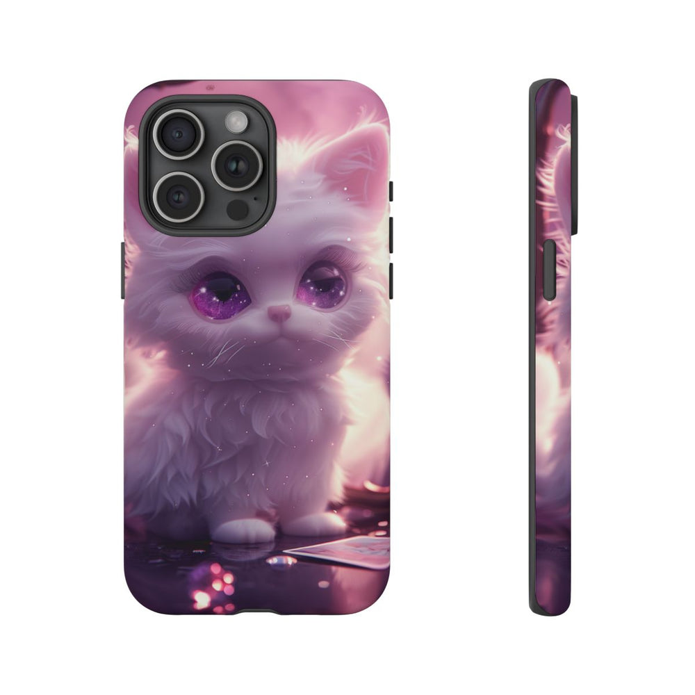 Dit hoesje toont een witte, pluizige kat met grote, fonkelende paarse ogen, zittend op een spiegelend oppervlak. Op de achtergrond zie je een vintage spiegel met een zachte roze en paarse gloed. De scène straalt een dromerige, magische sfeer uit met subtiele glinsteringen en zacht licht. Het matte, stevige hoesje bestaat uit twee lagen van polycarbonaat en TPU, is geschikt voor draadloos opladen en biedt bescherming tegen verschillende weersomstandigheden.