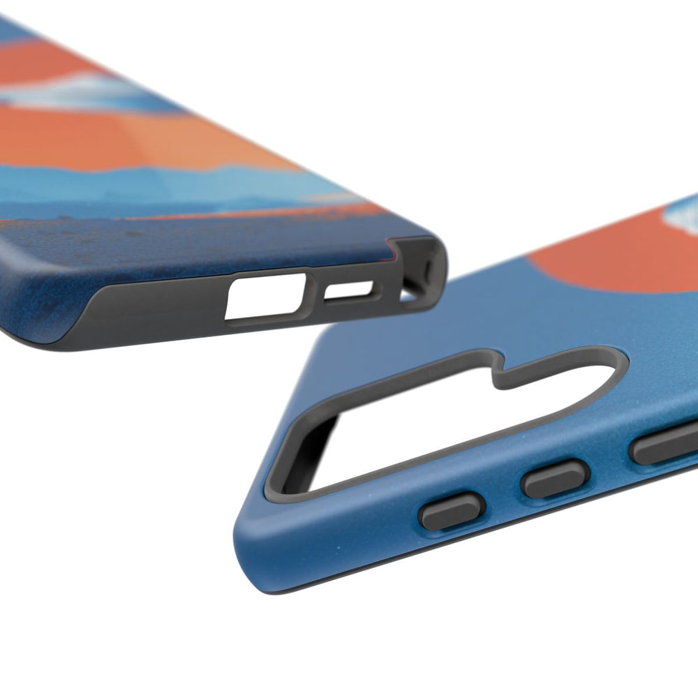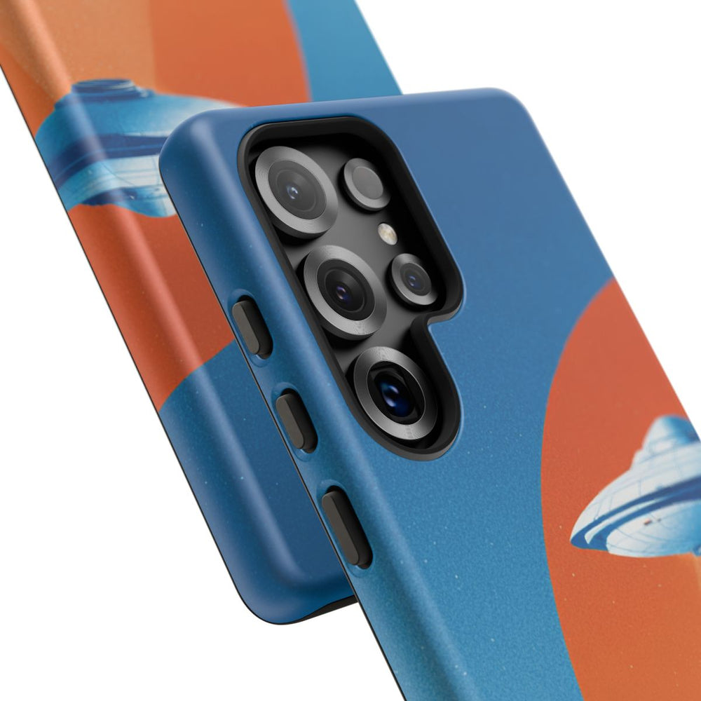 Dit hoesje toont een witte vliegende schotel die zweeft boven een rotsachtig en kaal landschap. Op de achtergrond is een grote oranje halve cirkel te zien, die doet denken aan een opkomende of ondergaande zon, tegen een diepblauwe hemel vol kleine sterren. In de verte zijn bergsilhouetten zichtbaar en op de voorgrond liggen verspreid enkele rotsen. Het ontwerp kenmerkt zich door strakke lijnen en een minimalistische stijl met een beperkt kleurenpalet van blauw, oranje en wit. Het hoesje bestaat uit twee lagen: een stevige buitenkant van polycarbonaat en een TPU-binnenzijde. Dit zorgt voor extra bescherming en ondersteunt draadloos opladen.