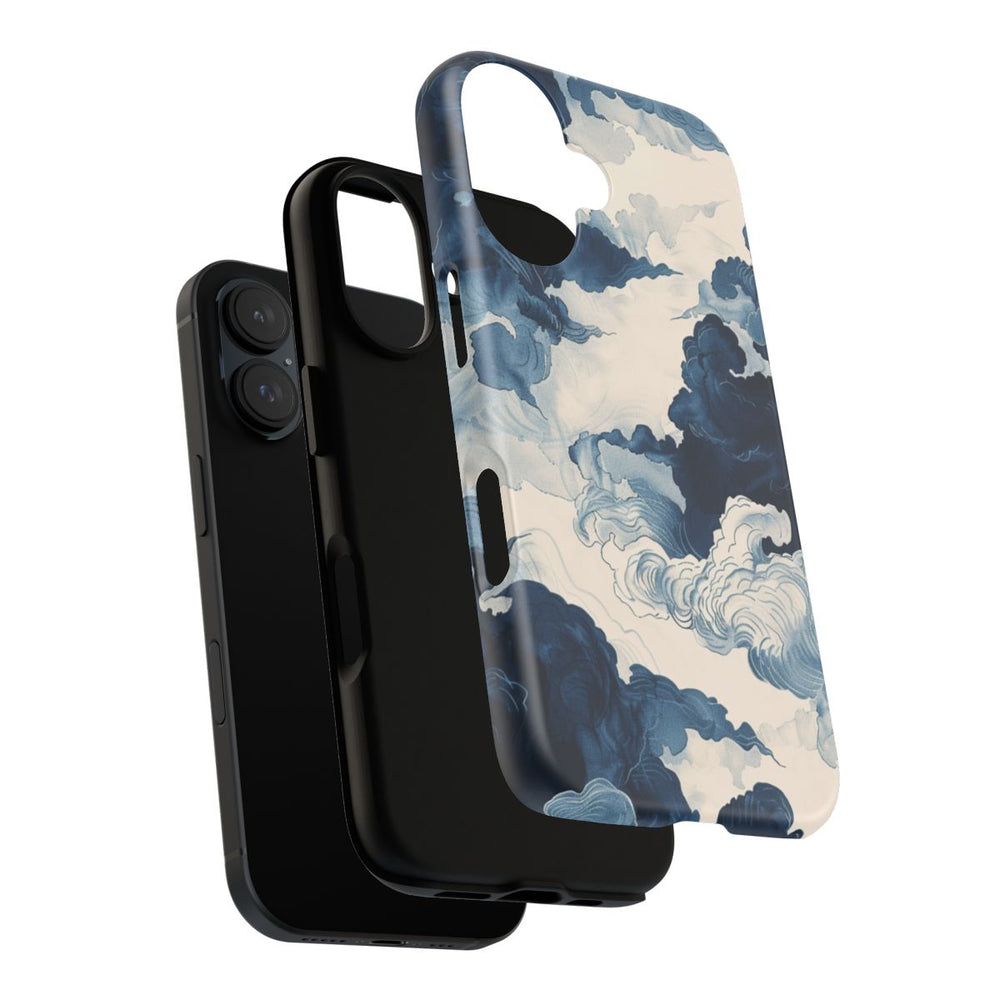 Dit hoesje is voorzien van een prachtige inktillustratie van wolken en lucht, uitgevoerd in verschillende tinten blauw en zwart. De verfijnde details van de wolken zorgen voor een dynamische en kunstzinnige uitstraling. Het matte, stevige hoesje is gemaakt van duurzame materialen en biedt extra bescherming. Dankzij de ondersteuning voor draadloos opladen is dit hoesje ook praktisch in het dagelijks gebruik. Ideaal voor liefhebbers van unieke en artistieke ontwerpen.