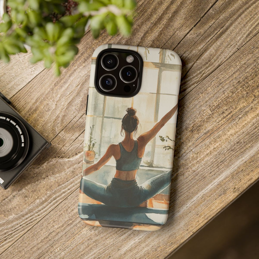 Dit ontwerp toont een vrouw die yoga beoefent in een rustige ruimte, gevuld met warm licht. De pasteltinten zorgen voor een kalme sfeer, terwijl de planten in potten de omgeving verfraaien. De aquarelstijl geeft het geheel een zachte uitstraling. Dit matte, stevige hoesje heeft een dubbele laag voor extra bescherming en is geschikt voor draadloos opladen. Perfect voor iedereen die waarde hecht aan rust en mindfulness in het dagelijks leven.