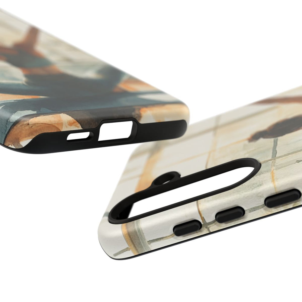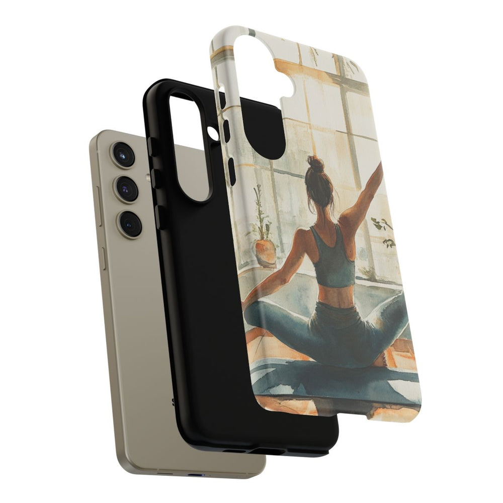 Dit ontwerp toont een rustgevend tafereel van een vrouw die yoga beoefent in een kamer vol warm licht. De zachte pasteltinten zorgen voor een kalme sfeer, versterkt door de aanwezigheid van planten bij het raam. Het kunstwerk is uitgevoerd in aquarelstijl, wat bijdraagt aan een gevoel van rust en aandacht. Dit matte, stevige hoesje heeft een dubbele laag voor extra duurzaamheid en bescherming en ondersteunt draadloos opladen. Het hoesje is speciaal ontworpen voor een perfecte pasvorm om de Galaxy S24 Plus.