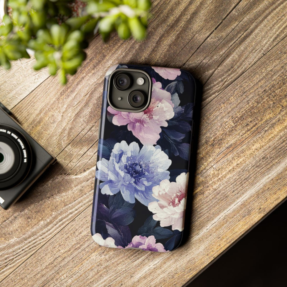 Dit ontwerp heeft een herhalend patroon van grote, zachte pastelbloemen in tinten roze, lila en lichtblauw. De bloemen worden omringd door donkere, gedempte bladeren die zorgen voor een opvallend contrast met de zwarte achtergrond. De bloemen hebben een schilderachtige textuur, wat het patroon een verfijnde en artistieke uitstraling geeft. Het patroon is gedrukt op een glanzend, stevig hoesje met een dubbele laag voor extra stevigheid en bescherming. Geschikt voor draadloos opladen.