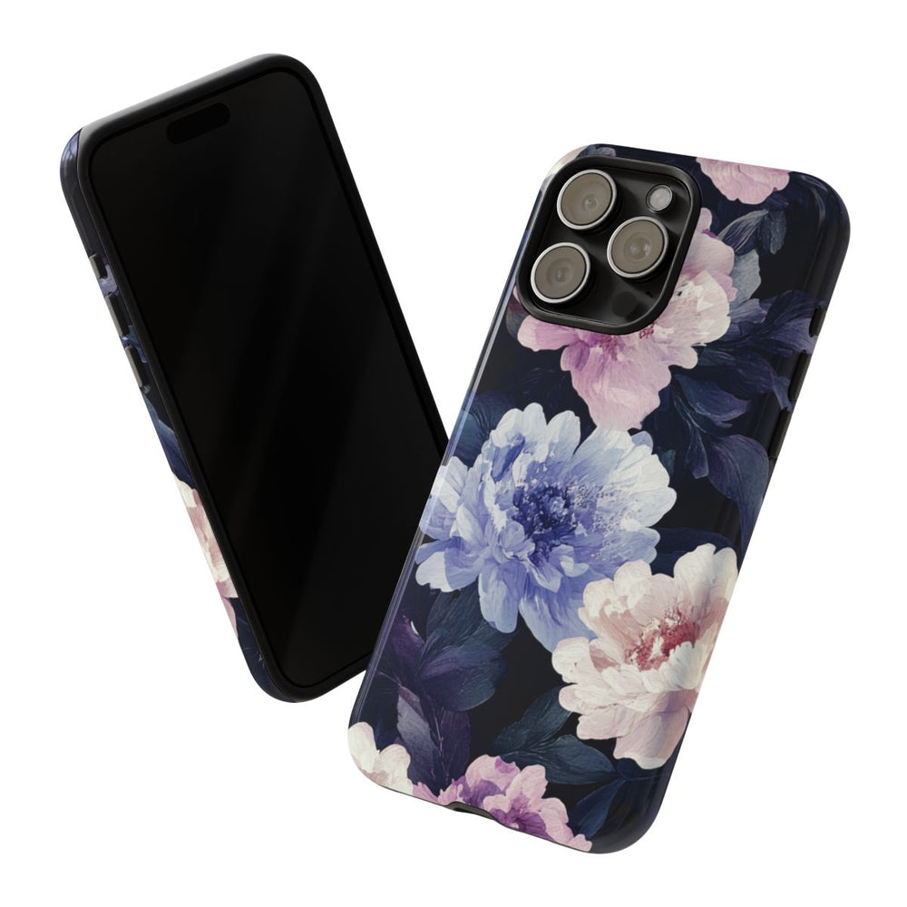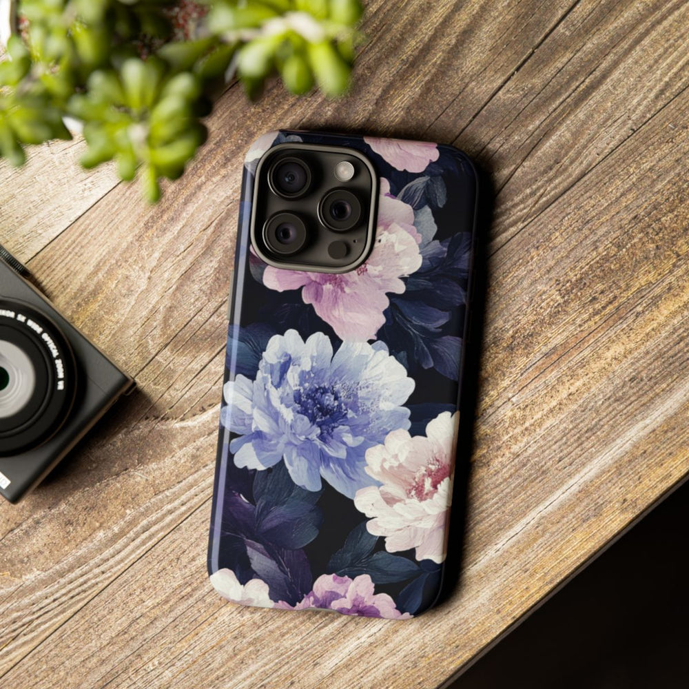 Dit ontwerp heeft een herhalend patroon van grote, zachte pastelbloemen in tinten roze, lila en lichtblauw. De bloemen worden omringd door donkere, gedempte bladeren die zorgen voor een opvallend contrast met de zwarte achtergrond. De bloemen hebben een schilderachtige textuur, wat het patroon een verfijnde en artistieke uitstraling geeft. Het patroon is gedrukt op een glanzend, stevig hoesje met een dubbele laag voor extra stevigheid en bescherming. Geschikt voor draadloos opladen.