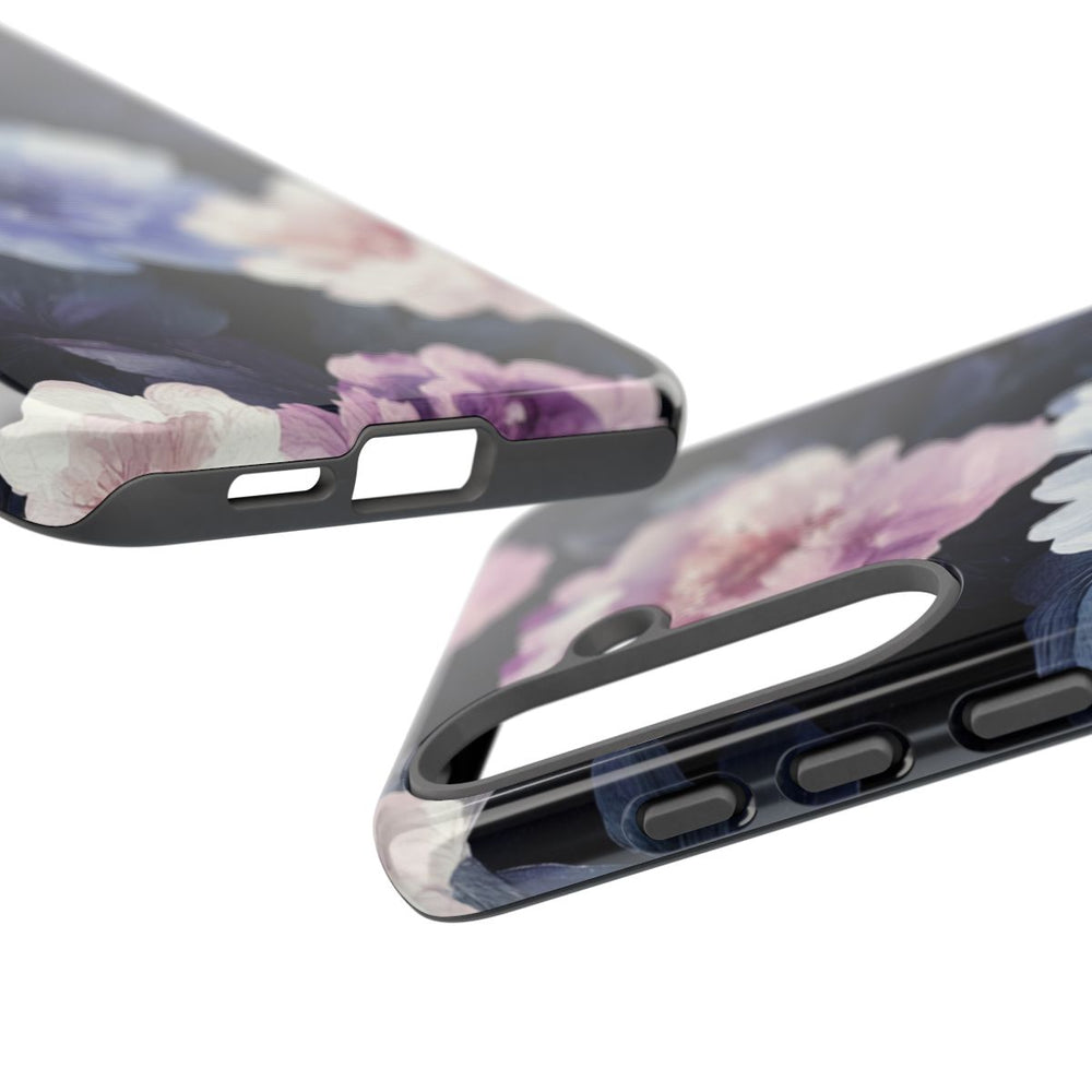 Dit ontwerp heeft een herhalend patroon van grote, zachte pastelbloemen in tinten roze, lila en lichtblauw. De bloemen worden omringd door donkere, gedempte bladeren die zorgen voor een opvallend contrast met de zwarte achtergrond. De bloemen hebben een schilderachtige textuur, wat het patroon een verfijnde en artistieke uitstraling geeft. Het patroon is gedrukt op een glanzend, stevig hoesje met een dubbele laag voor extra stevigheid en bescherming. Geschikt voor draadloos opladen.