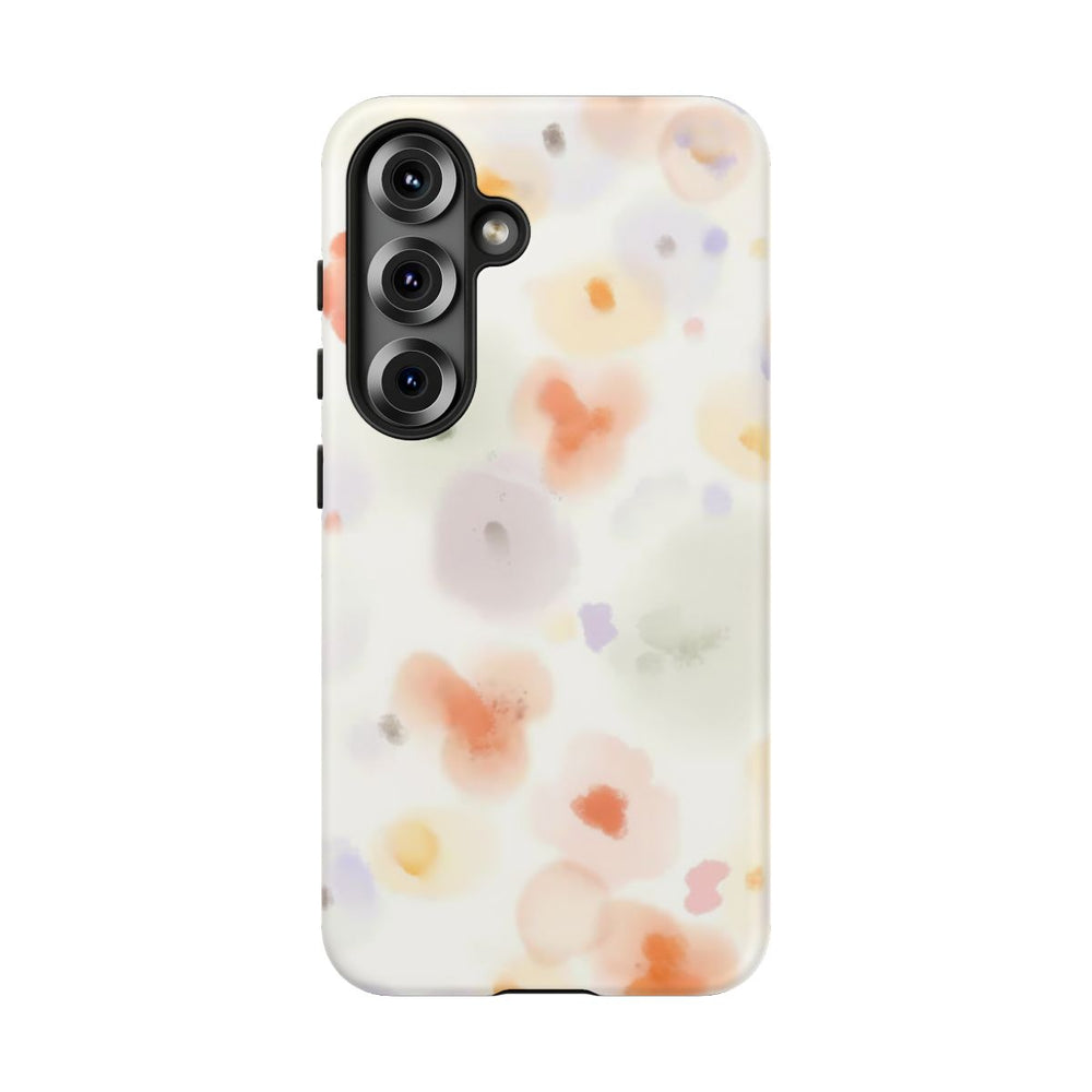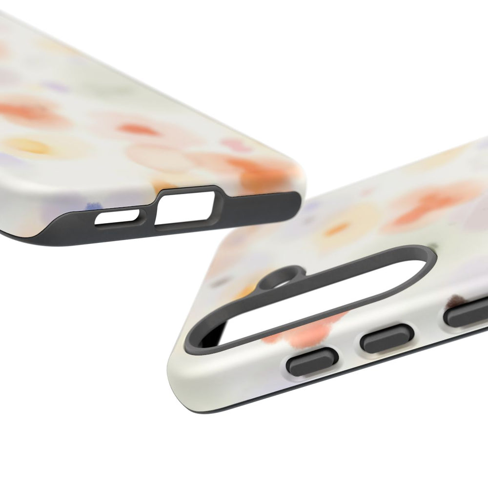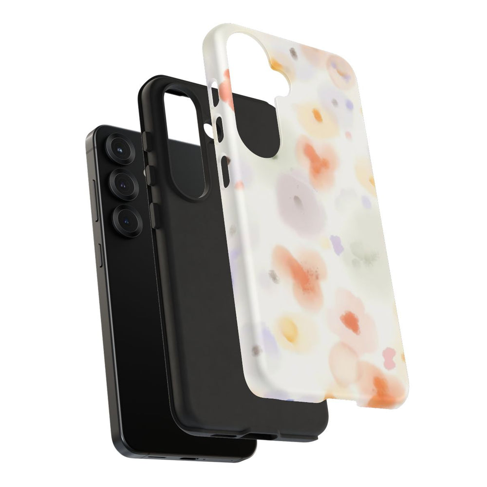 Dit hoesje heeft een zacht waterverf bloemenpatroon met verschillende vervaagde bloemvormen in pasteltinten oranje, blauw, groen en beige op een witte achtergrond. De kleuren vloeien subtiel in elkaar over en zorgen voor een lichte, luchtige uitstraling. Het hoesje bestaat uit twee lagen: een matte buitenkant van polycarbonaat en een TPU-voering voor extra bescherming. Daarnaast ondersteunt het hoesje draadloos opladen. Dit model is speciaal ontworpen voor een specifiek type smartphone.