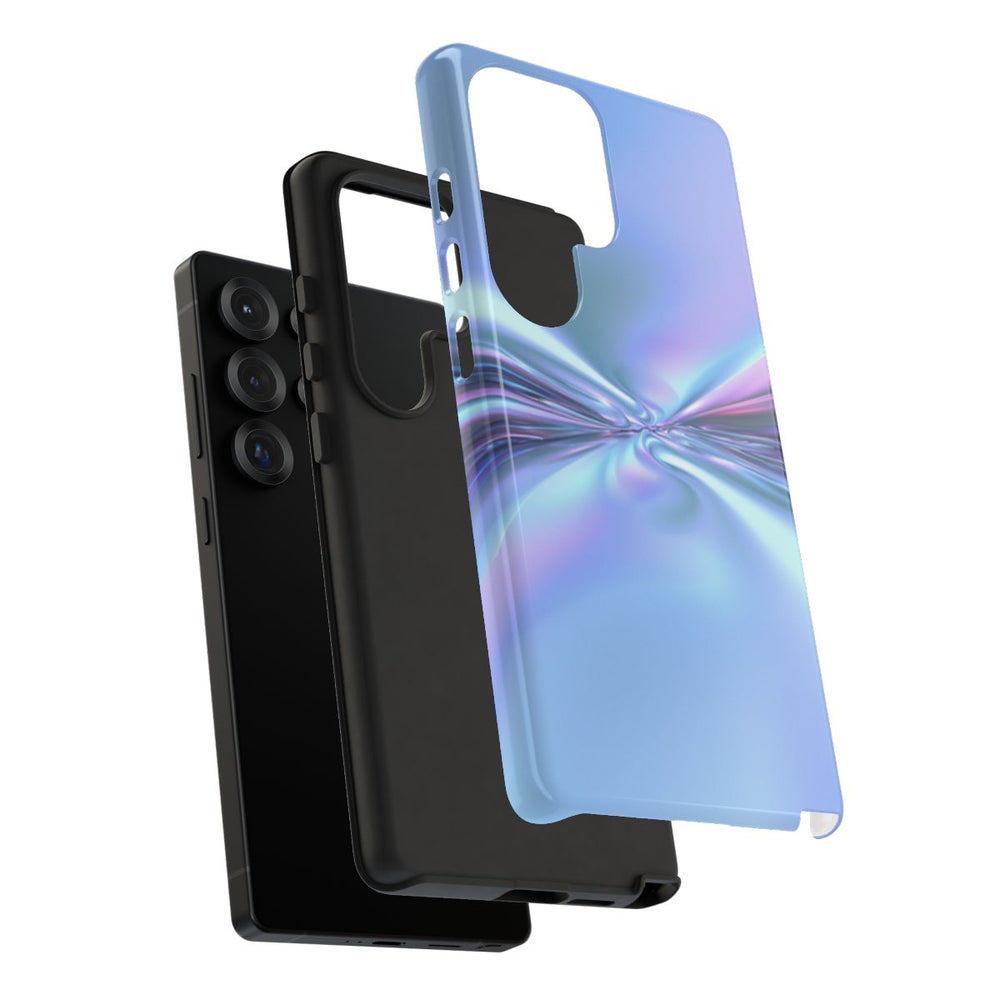 Dit hoesje heeft een gladde, zijdezachte structuur met een reflecterend spiraalpatroon dat zorgt voor een dromerig en golvend effect. De kleuren lopen zacht in elkaar over in tinten blauw, paars en lichtroze, wat het ontwerp een etherische en vloeiende uitstraling geeft. De afbeelding is gedrukt op een glanzend en stevig hoesje met een dubbele laag van een polycarbonaat buitenkant en een TPU binnenzijde. Dit biedt extra stevigheid en bescherming. Het hoesje ondersteunt draadloos opladen en is uitstekend bestand tegen weersinvloeden en behoudt langdurig zijn optische kwaliteit.
