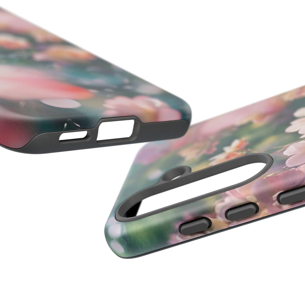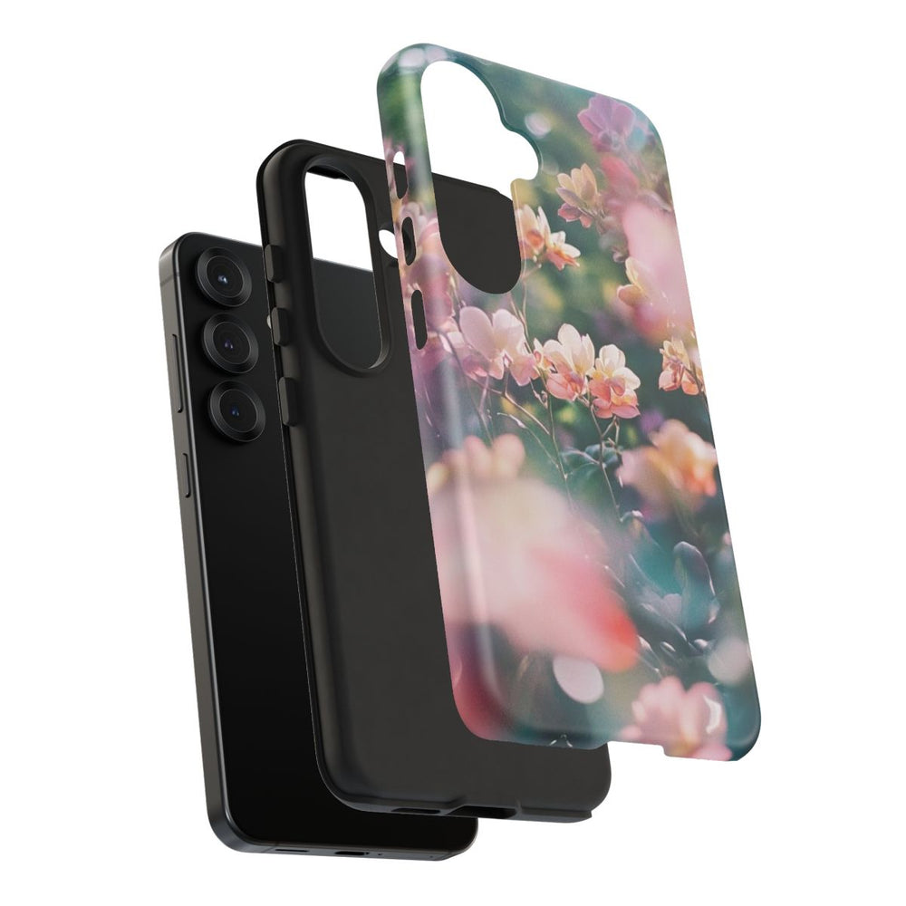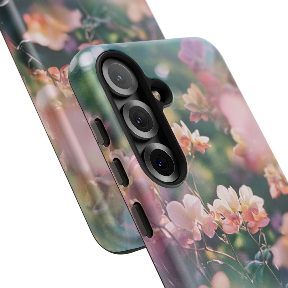 Dit telefoonhoesje is versierd met sierlijke bloemen in zachte roze- en perziktinten, afgebeeld tegen een subtiel vervaagde natuurlijke achtergrond. De bloemen zijn sfeervol belicht, wat zorgt voor een dromerige en luchtige uitstraling. Dankzij de combinatie van scherp afgebeelde en vager weergegeven bloemen ontstaat er een mooi diepte-effect. De afbeelding is gedrukt op een glanzend, stevig hoesje van polycarbonaat en TPU, dat bestaat uit twee lagen voor optimale bescherming en geschikt is voor draadloos opladen. Het geheel heeft een zachte, bloemige uitstraling en is ideaal voor liefhebbers van de natuur.